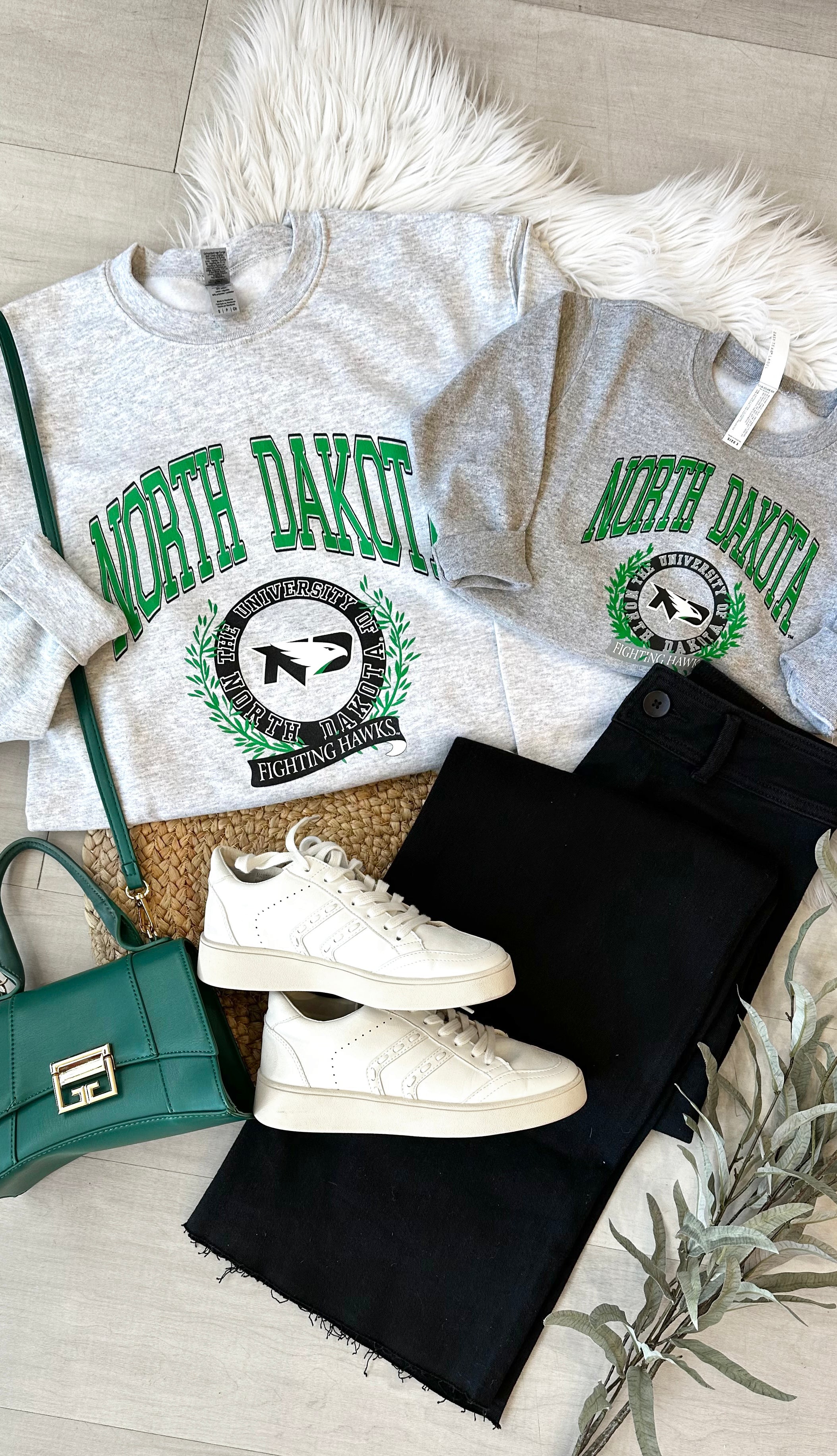 This North Dakota Fighting Hawks sweatshirt has a design with a throwback look in mind. Has a soft, fleece like, inside and a true to size length and fit. If you are going for an oversized look, we recommend sizing up one.