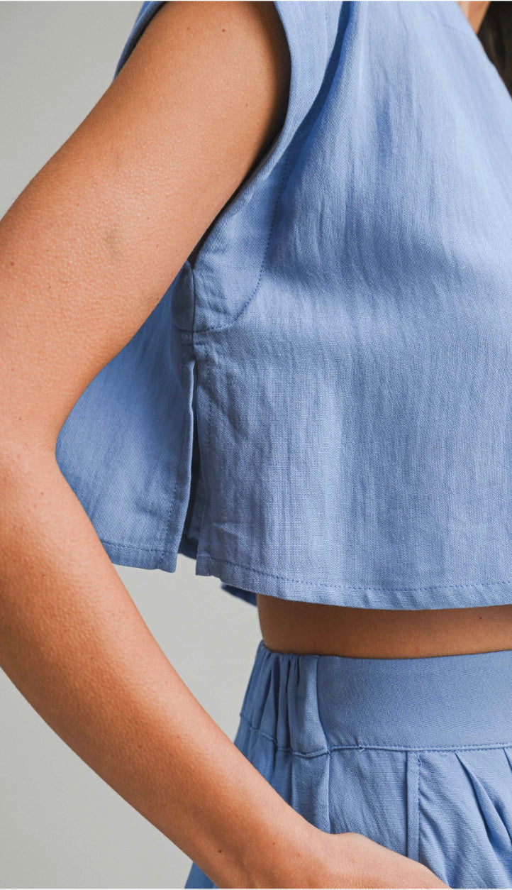 A linen like crop top and midi flare skirt with side pocket set. Perfect for an upcoming vacation!