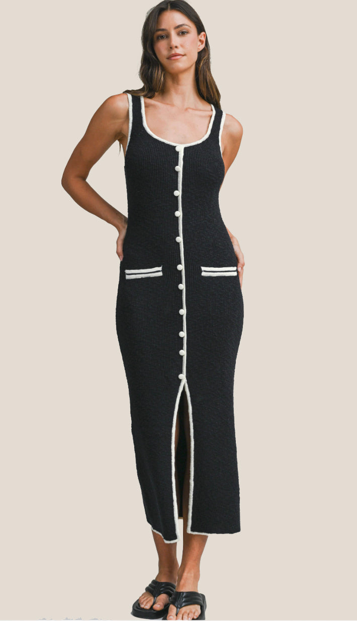 A sleeveless knit non-functional button down with contrast binding bodycon midi dress with front slit and non-functional pockets. Made out of 100% rayon. Model is 5'8 wearing a size small. Fits true to size.