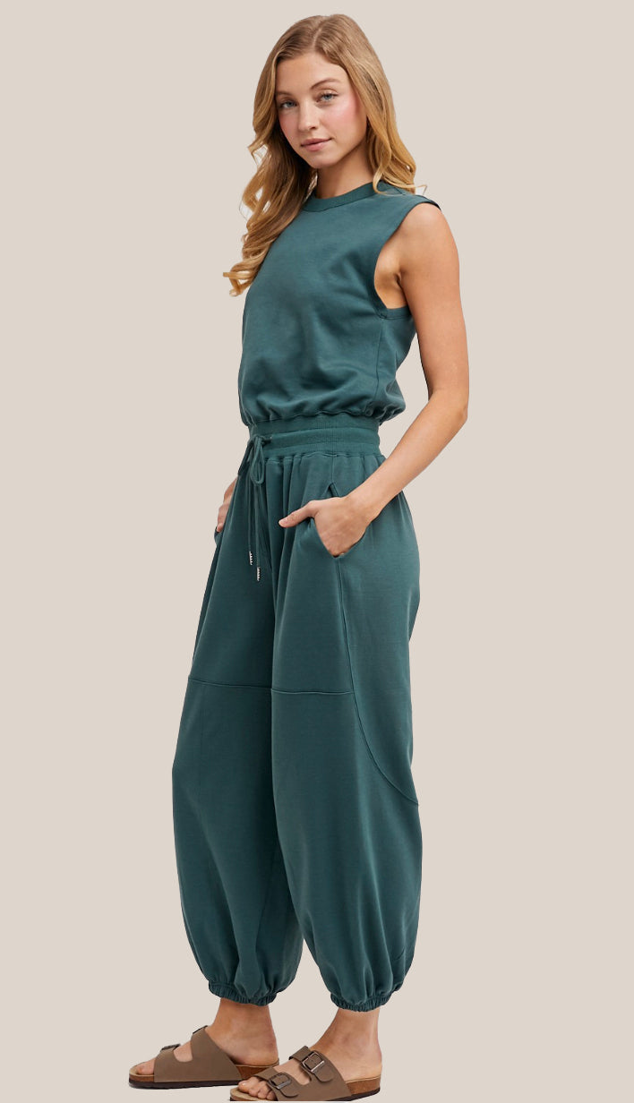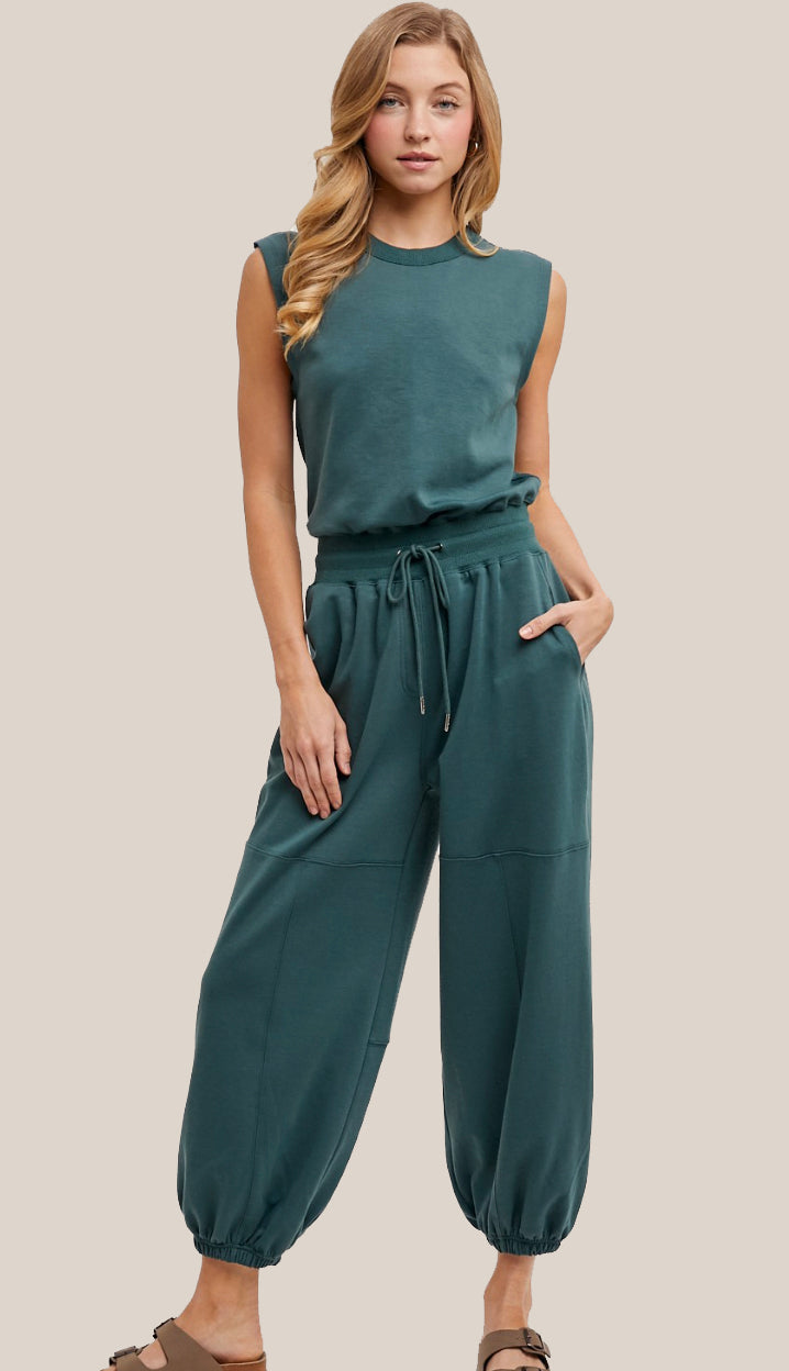 Drawstring Waist Sleeveless Knit Active Jumpsuit- Hunter Green