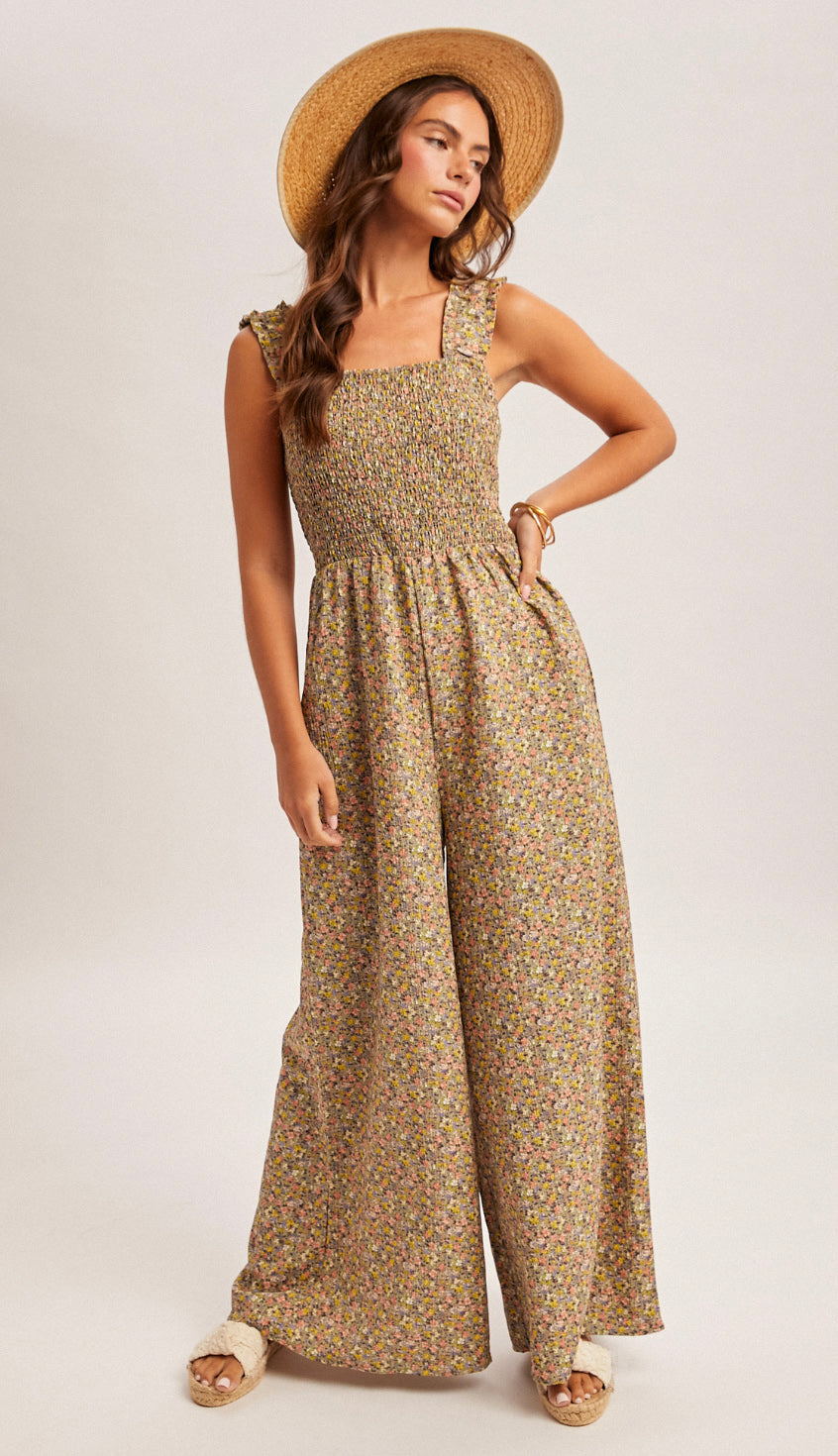 Greta Smocked Ditsy Floral Jumpsuit- Sage