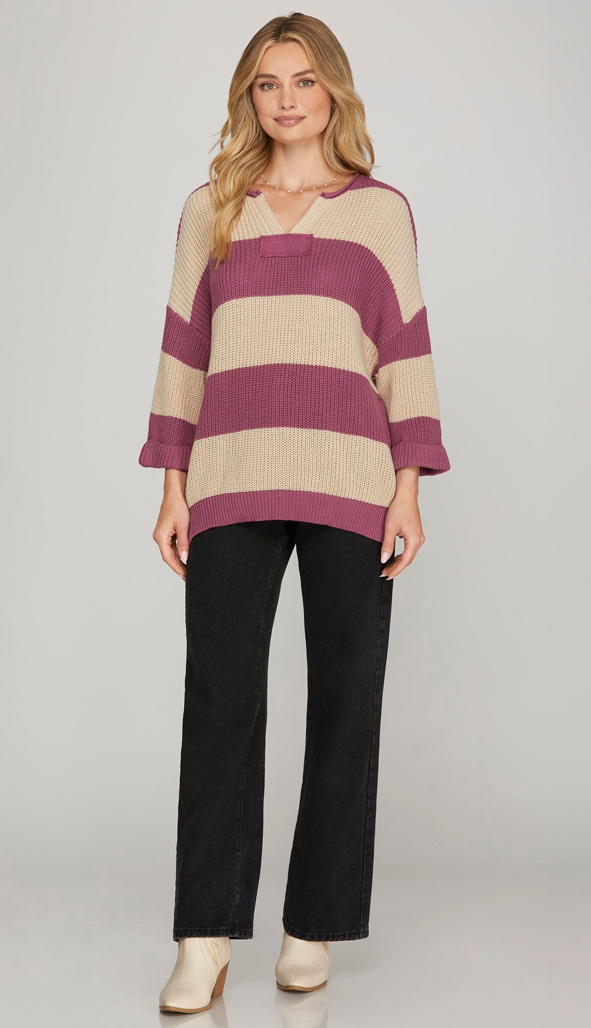 A 3/4 sleeve v neck striped sweater with a lightweight feel and fit to it. Great to take into the spring. Made out of 100% cotton. Model is 5'8 wearing a size small. Fits true to size.