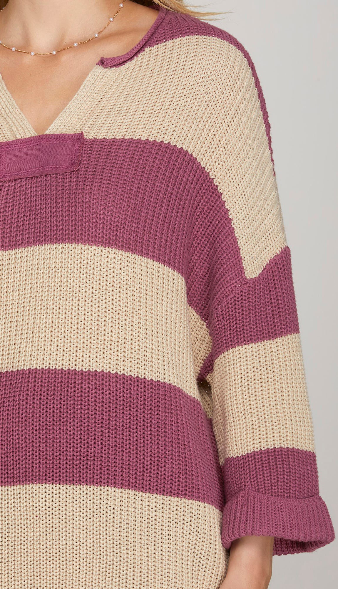 A 3/4 sleeve v neck striped sweater with a lightweight feel and fit to it. Great to take into the spring. Made out of 100% cotton. Model is 5'8 wearing a size small. Fits true to size.
