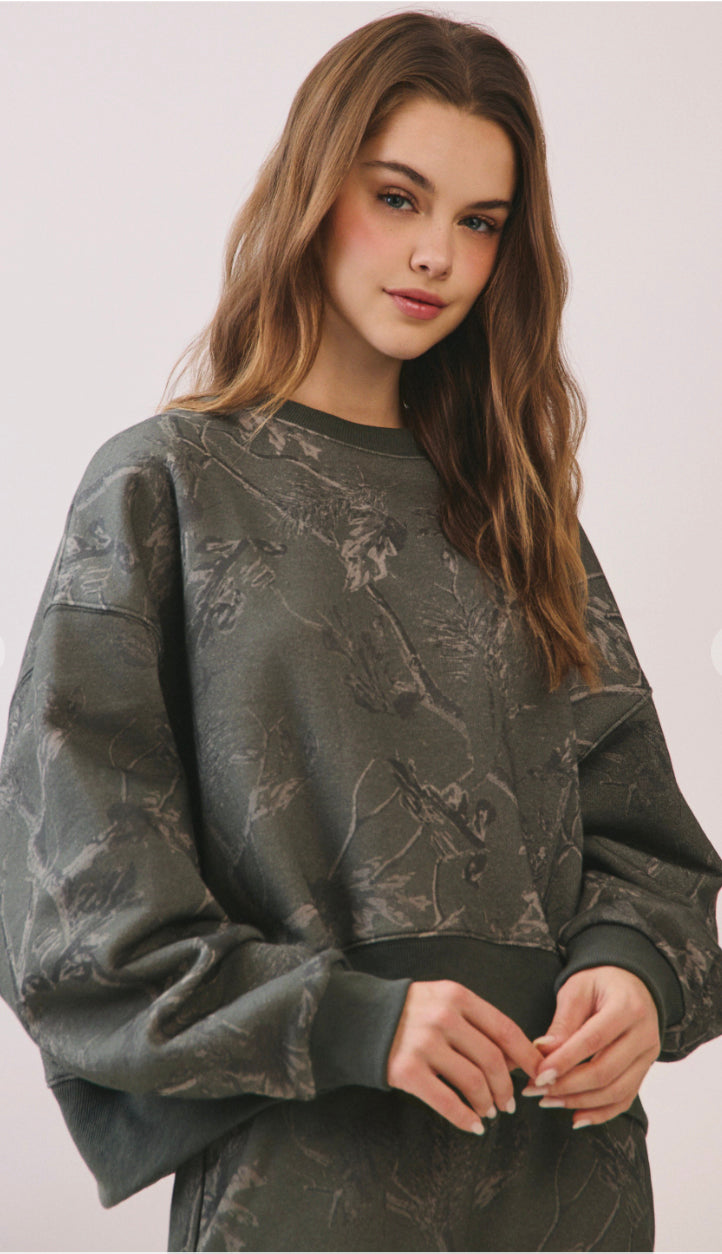 Camouflage Print Dropped Shoulders Sweatshirt- Olive