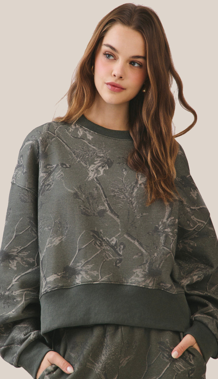 A camouflage print round-neck sweatshirt featuring dropped shoulders.