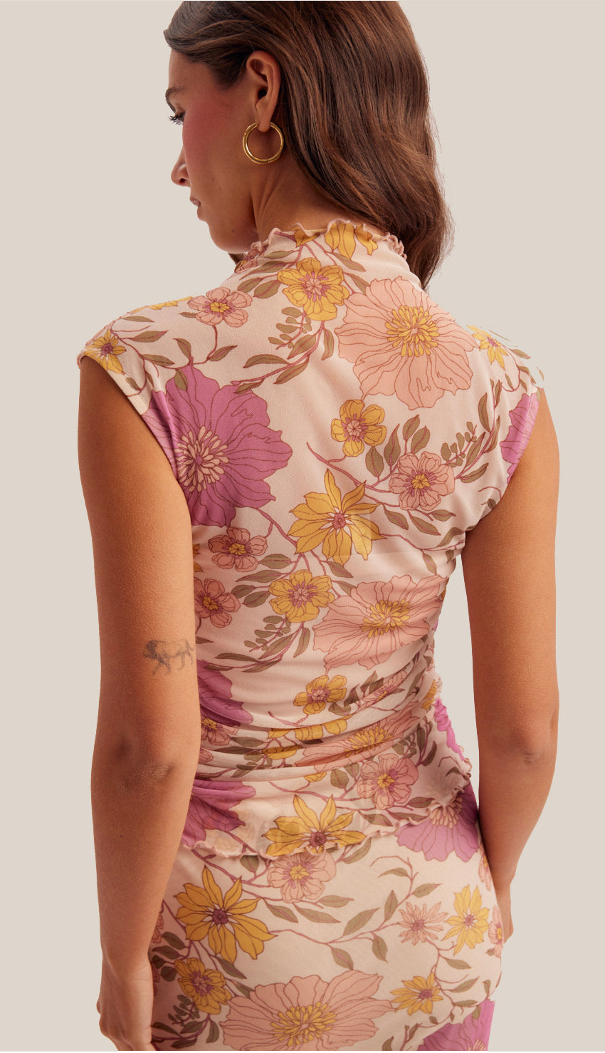 A gorgeous floral print ruched mesh top. Pair it with the matching mesh top for a chic outfit.