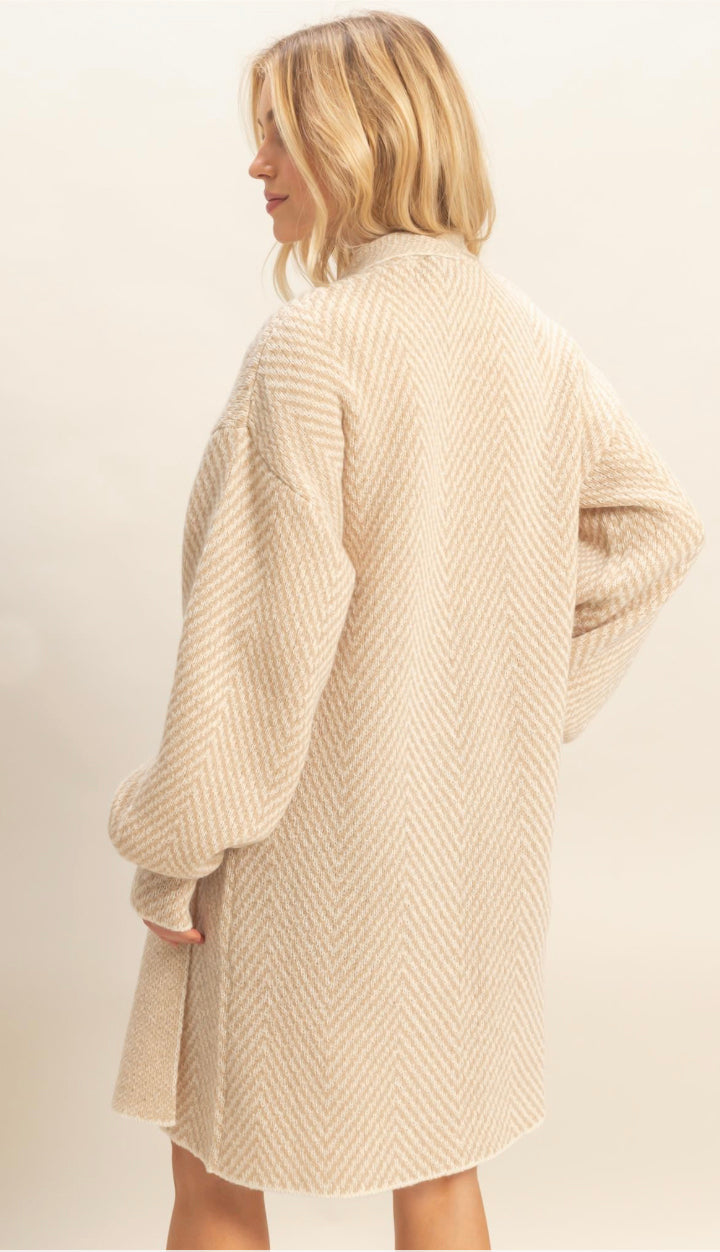 This herringbone sweater cardigan has an open-front silhouette is covered in a chic herringbone pattern that is the perfect neutral, framed with drop shoulders and long balloon sleeves with cinched cuffs to keep you warm.