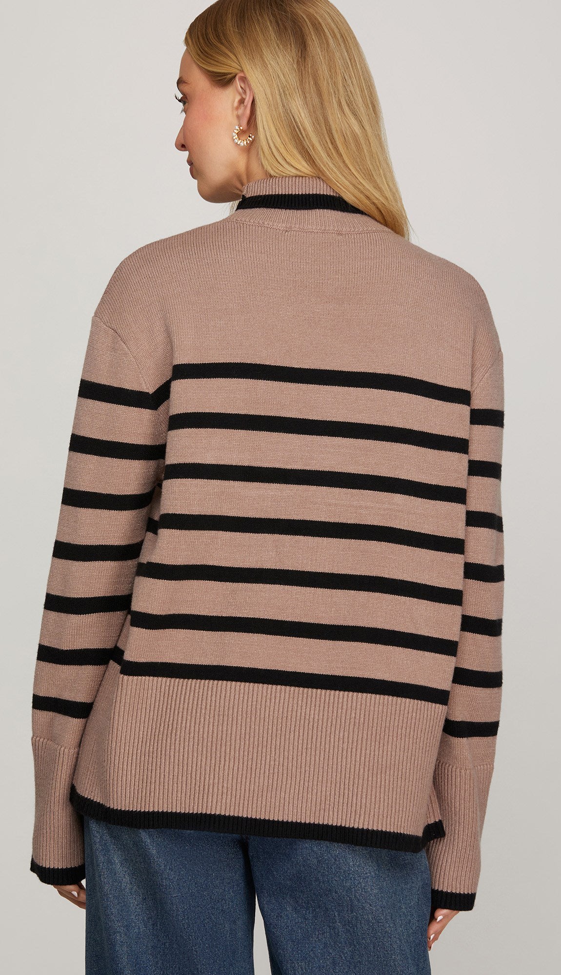 A long sleeve mock neck striped sweater with an ultra soft fabric. Made out of 50% viscose, 25% polyester, and 25% nylon. Model is 5'9 wearing a size small. Fits true to size.