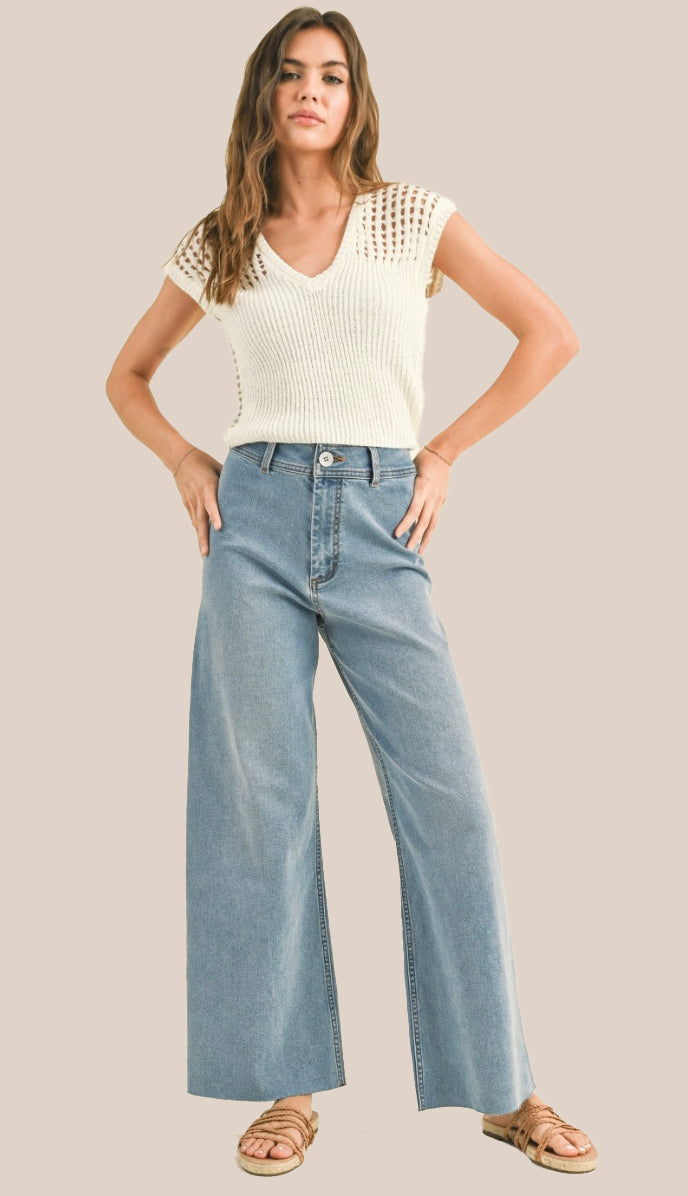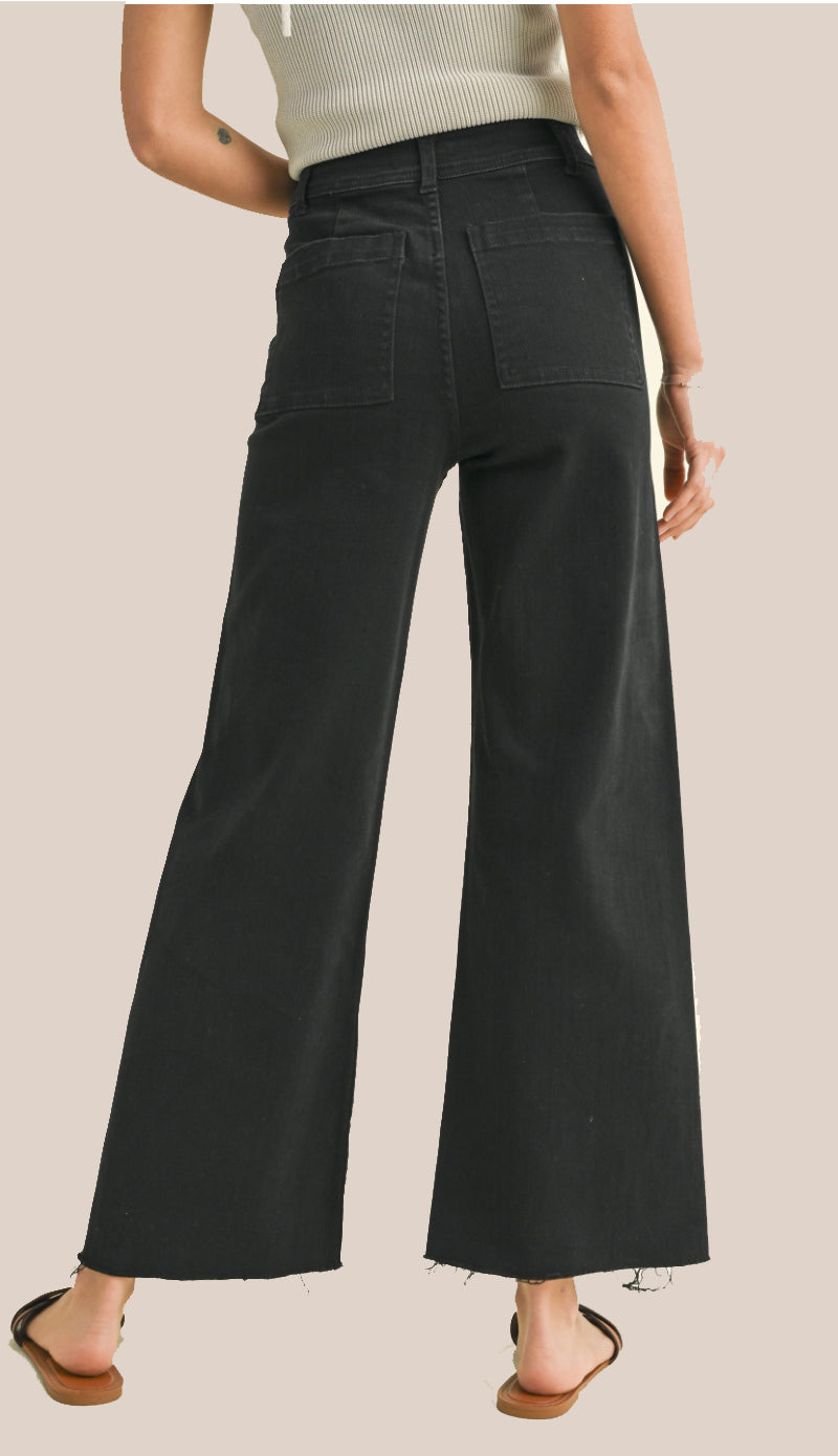 A straight wide leg denim pant with a darker faded black coloring. Has a slightly frayed hem at the bottom. Made out of 98% cotton and 2% spandex. Model is 5'7 wearing a size small. Fit true to size and have a little stretch. These are very comfortable!