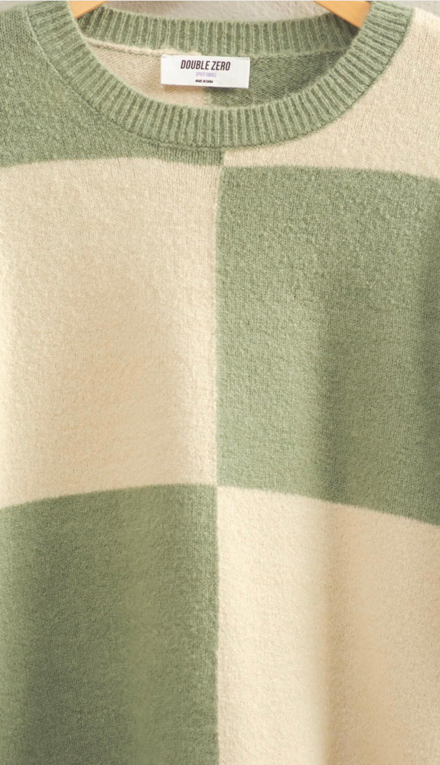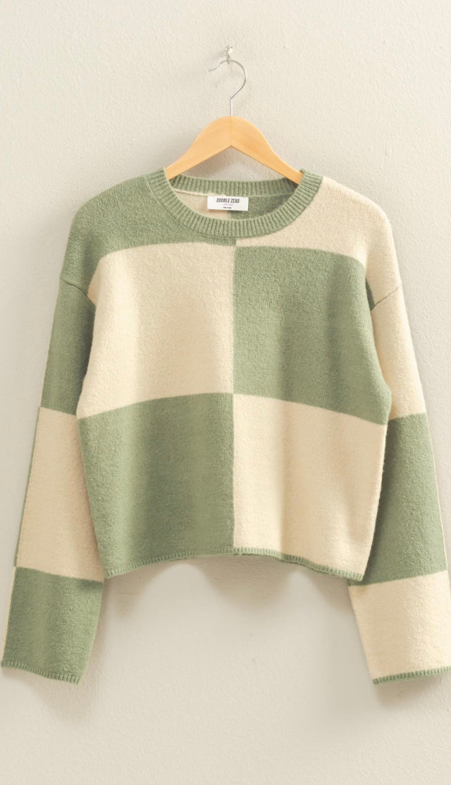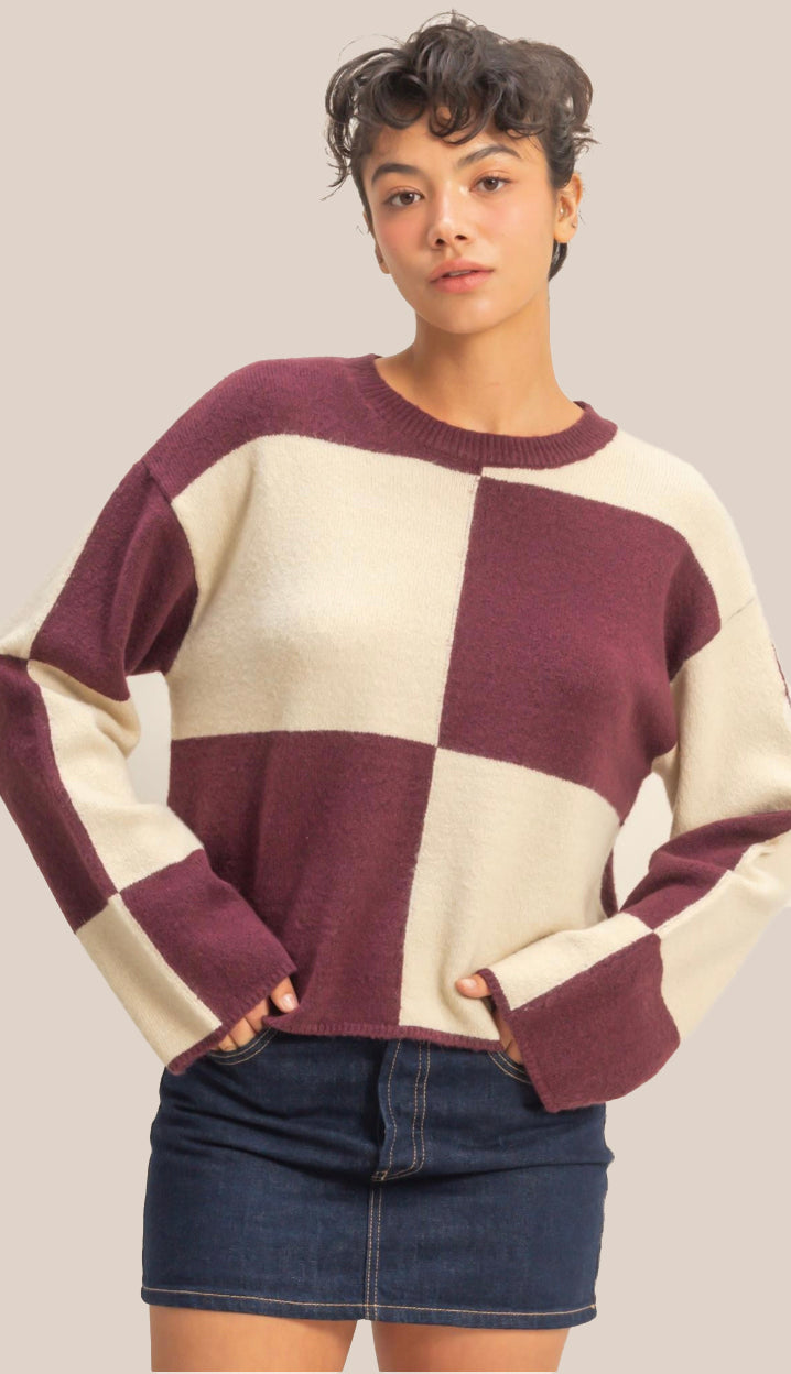 A soft oversized checkered sweater with a subtle bell sleeve and "longer" cropped fit. Model is 5'8 wearing a size small. Fits loose but we recommend sticking with your true size.