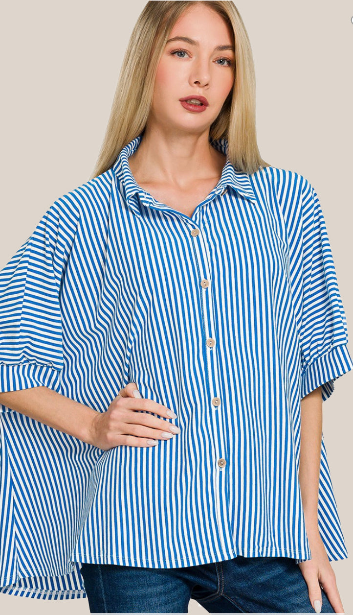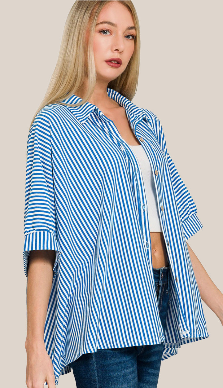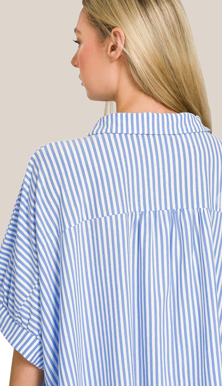 Shore Thing Oversized Striped Button Shirt- Ocean Blue