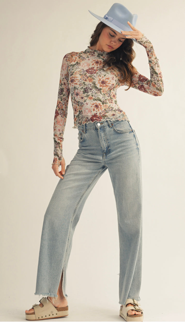 A mesh top with a gorgeous floral print and scalloped hemline. Has thumb holes. Made out of 94% polyester and 6% spandex. Model is 5'9 wearing a size small. Fits true to size.