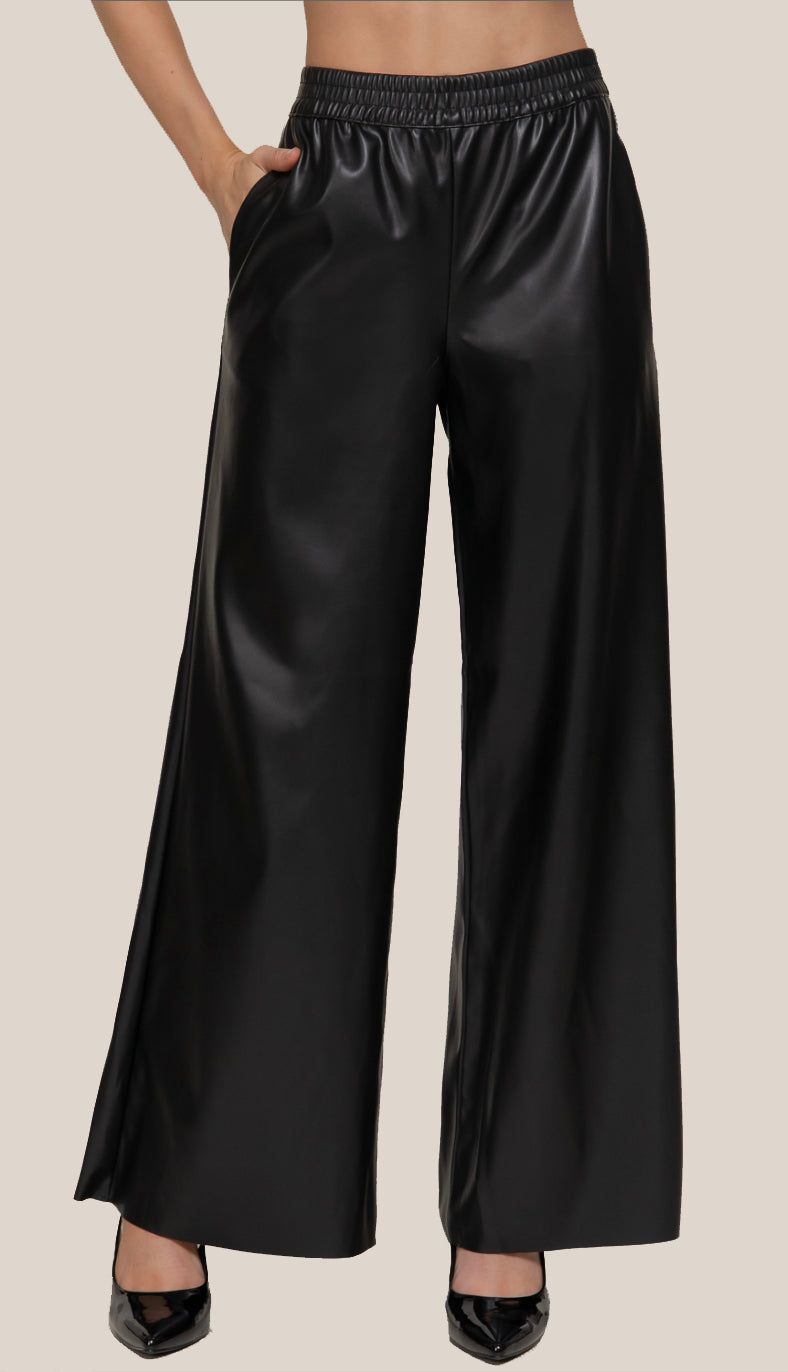 A straight faux leather long pant that is on trend and will take your outfit up to the next level. Not to mention insanely comfortable with the elastic waistband.