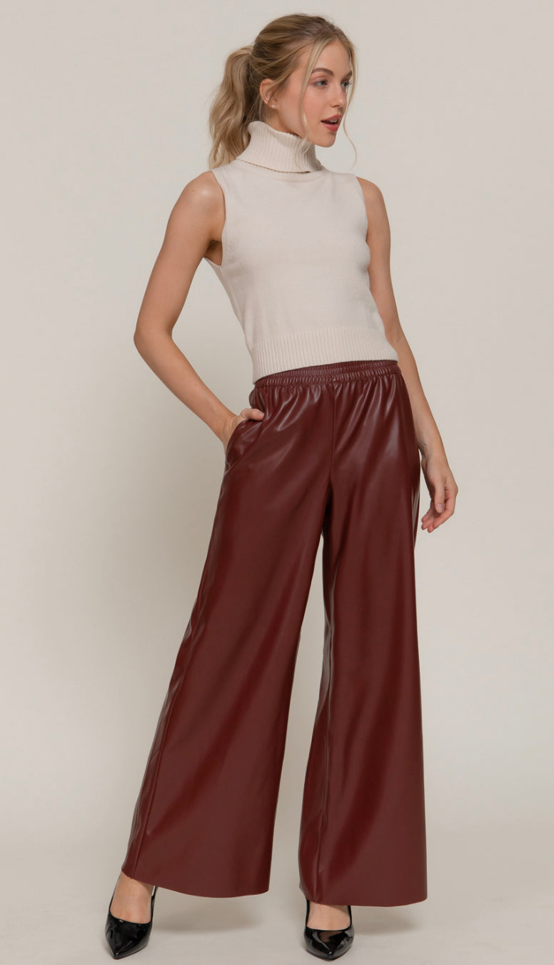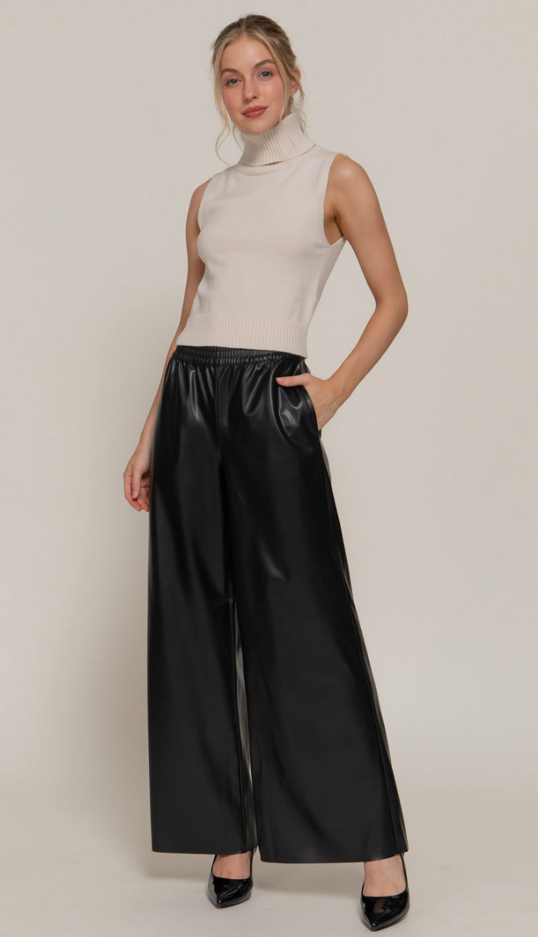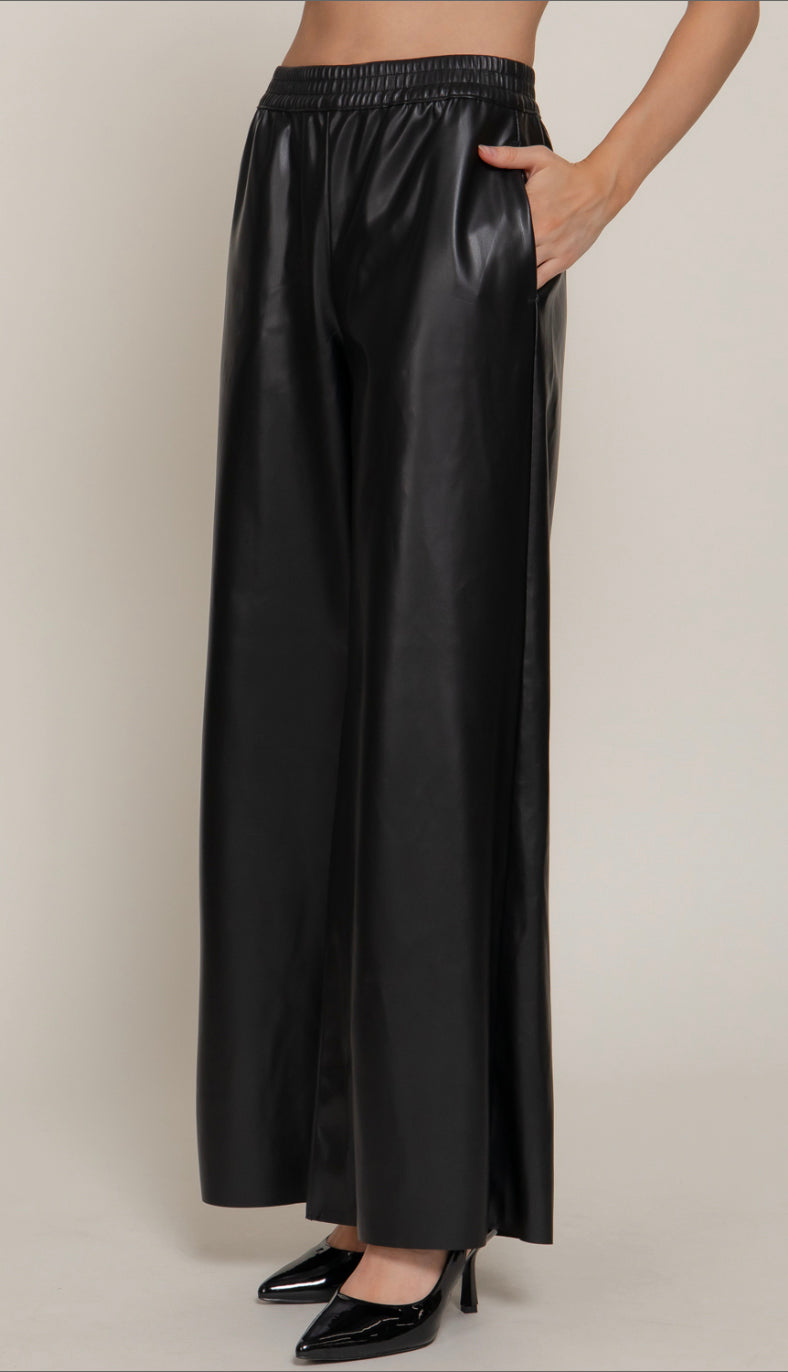 A straight faux leather long pant that is on trend and will take your outfit up to the next level. Not to mention insanely comfortable with the elastic waistband.