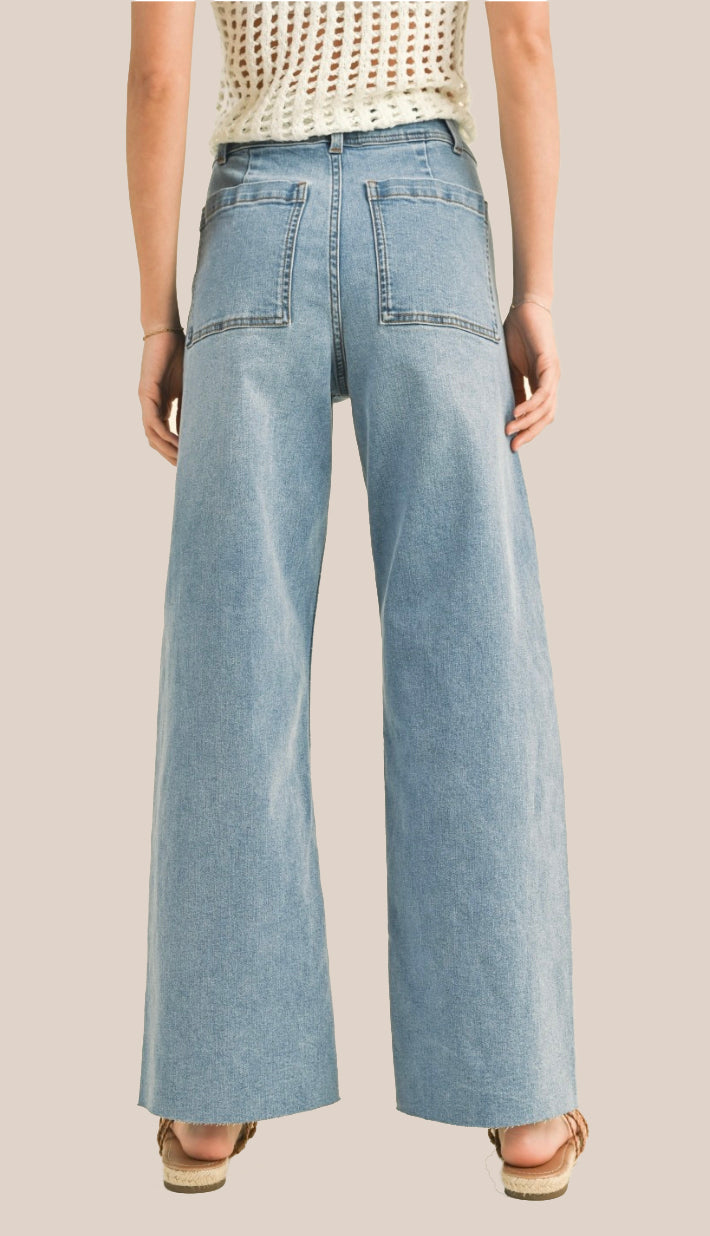 A straight wide leg denim pant with a darker faded black coloring. Has a slightly frayed hem at the bottom. Made out of 98% cotton and 2% spandex. Model is 5'7 wearing a size small. Fit true to size and have a little stretch. These are very comfortable!