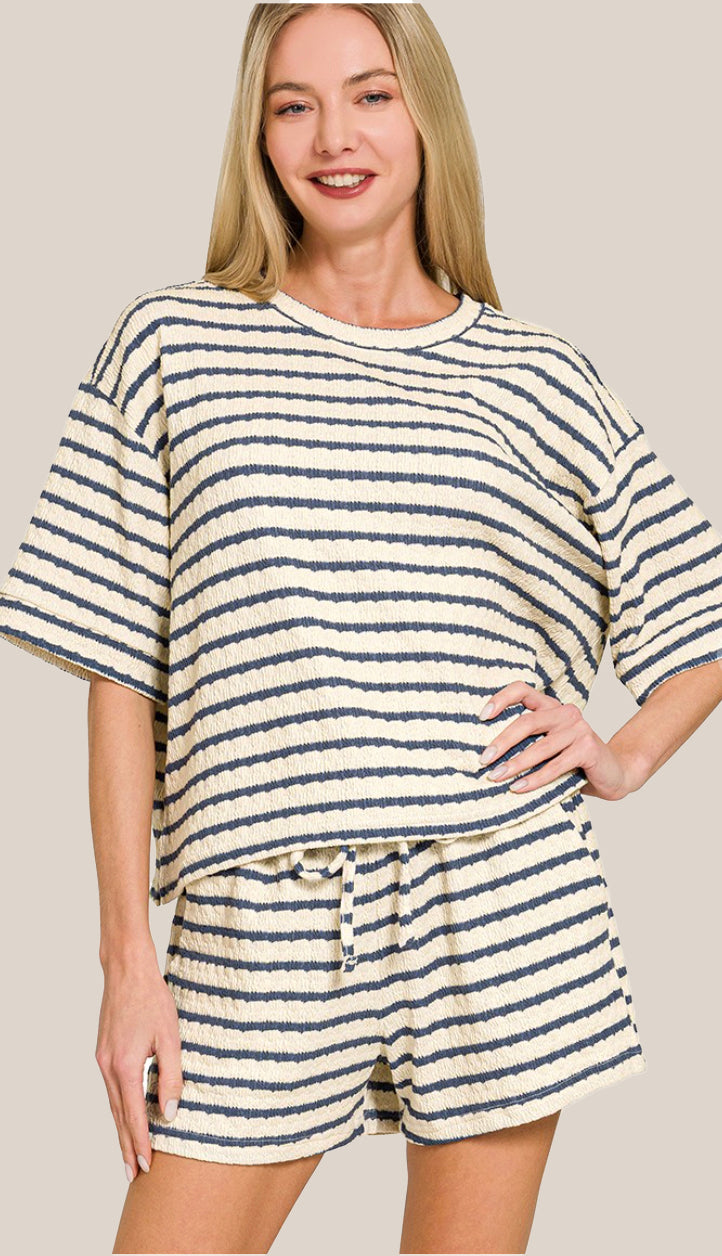 A striped short sleeve tee and shorts set perfect for your upcoming vacation or a summer day. They are sold together but you can always wear as separates.