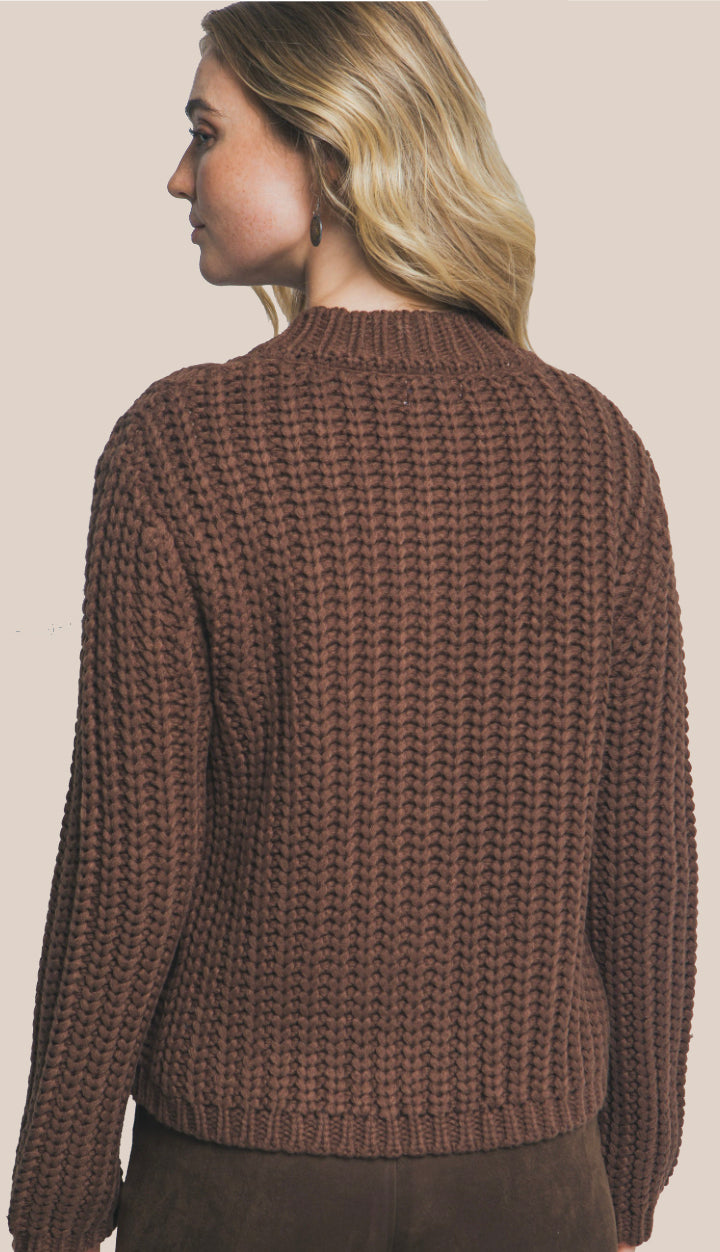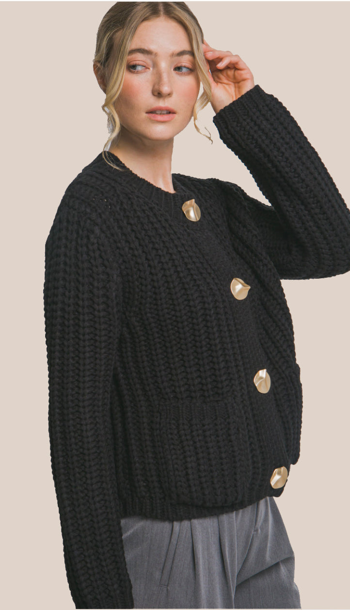 A chunky long sleeve gold button closure and front pockets sweater cardigan. Cute worn buttoned or open with a basic underneath.