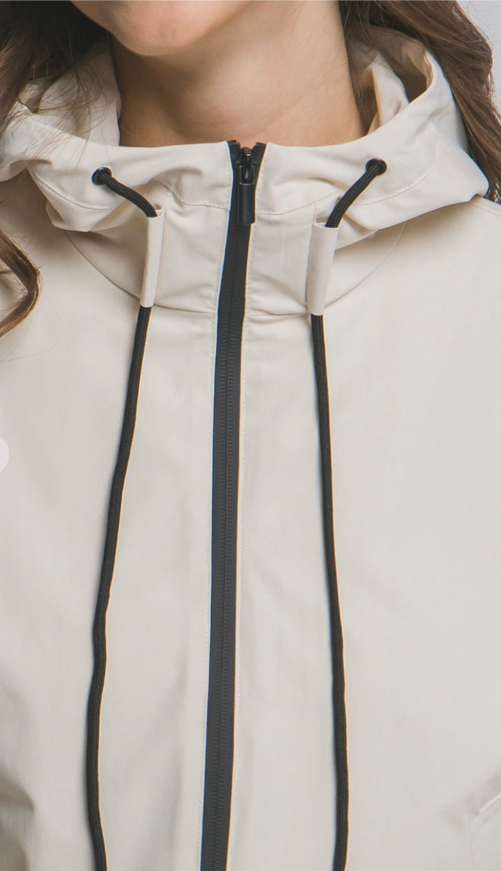 A hooded full zip lightweight jacket with adjustable drawstrings, is lined, has side pockets, and cinched waist and cuffs. Such a cute athleisure look to wear with leggings and ankle socks. Made out of 100% polyester. Model is 5'9 wearing a size small. Fits true to size.