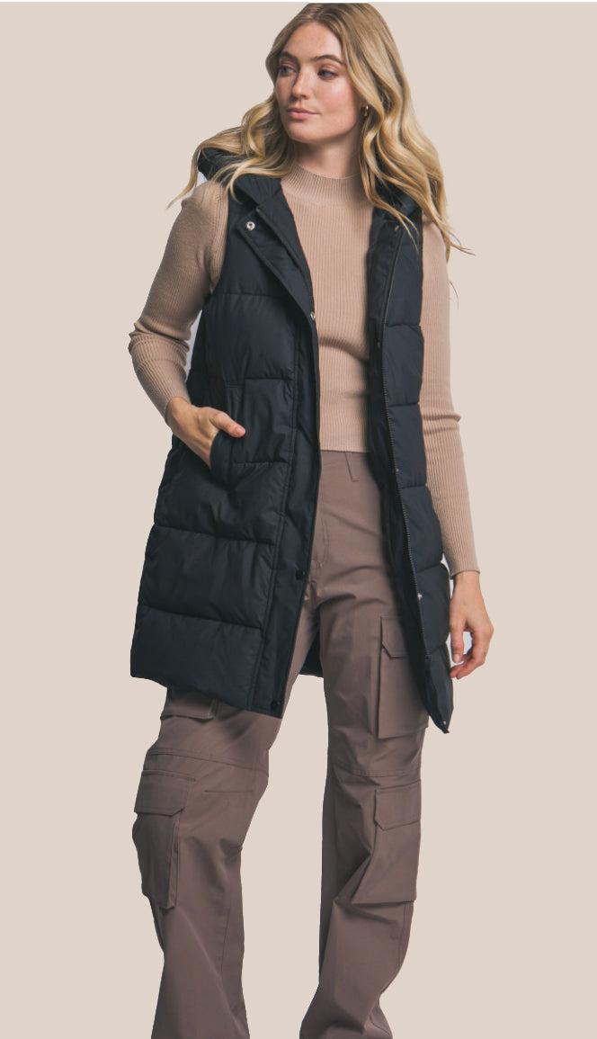 Bringing Warmth Hooded Long Quilted Puffer Vest- Black