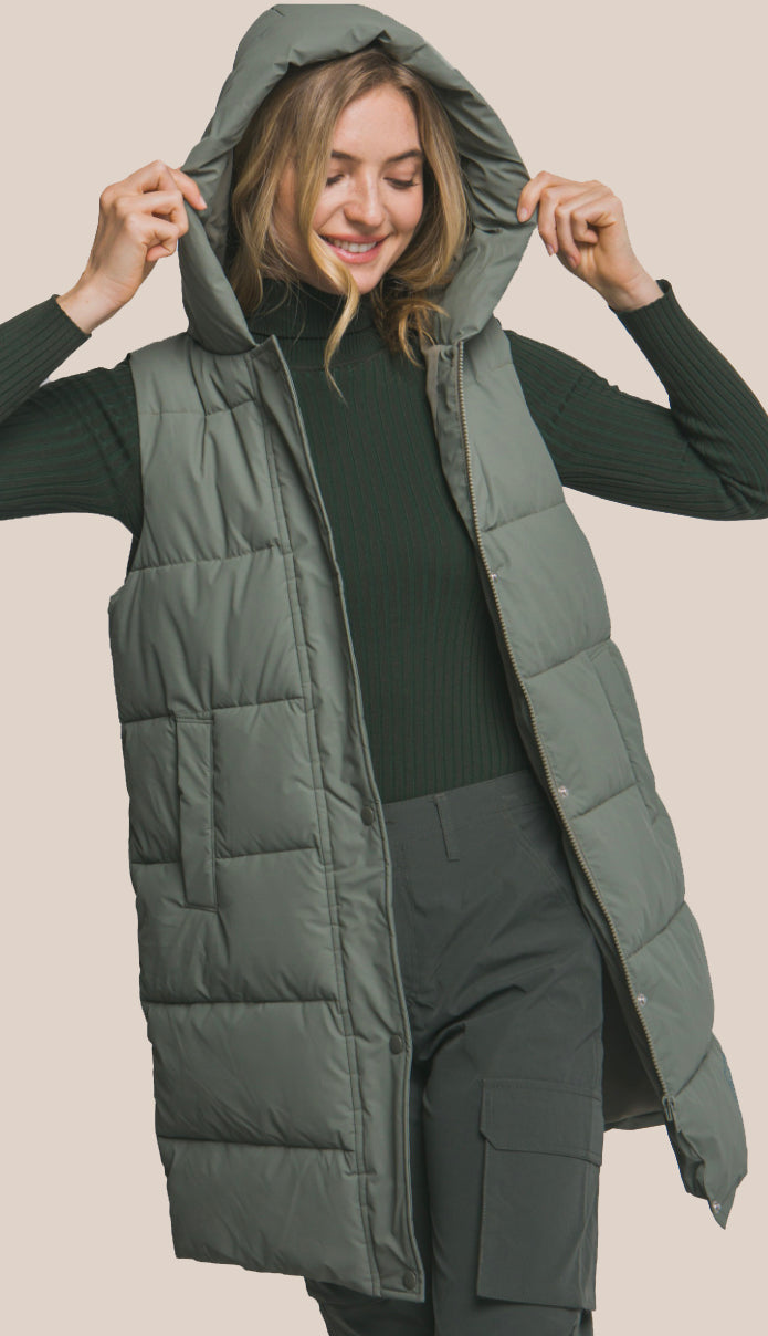 Bringing Warmth Hooded Long Quilted Puffer Vest- Olive