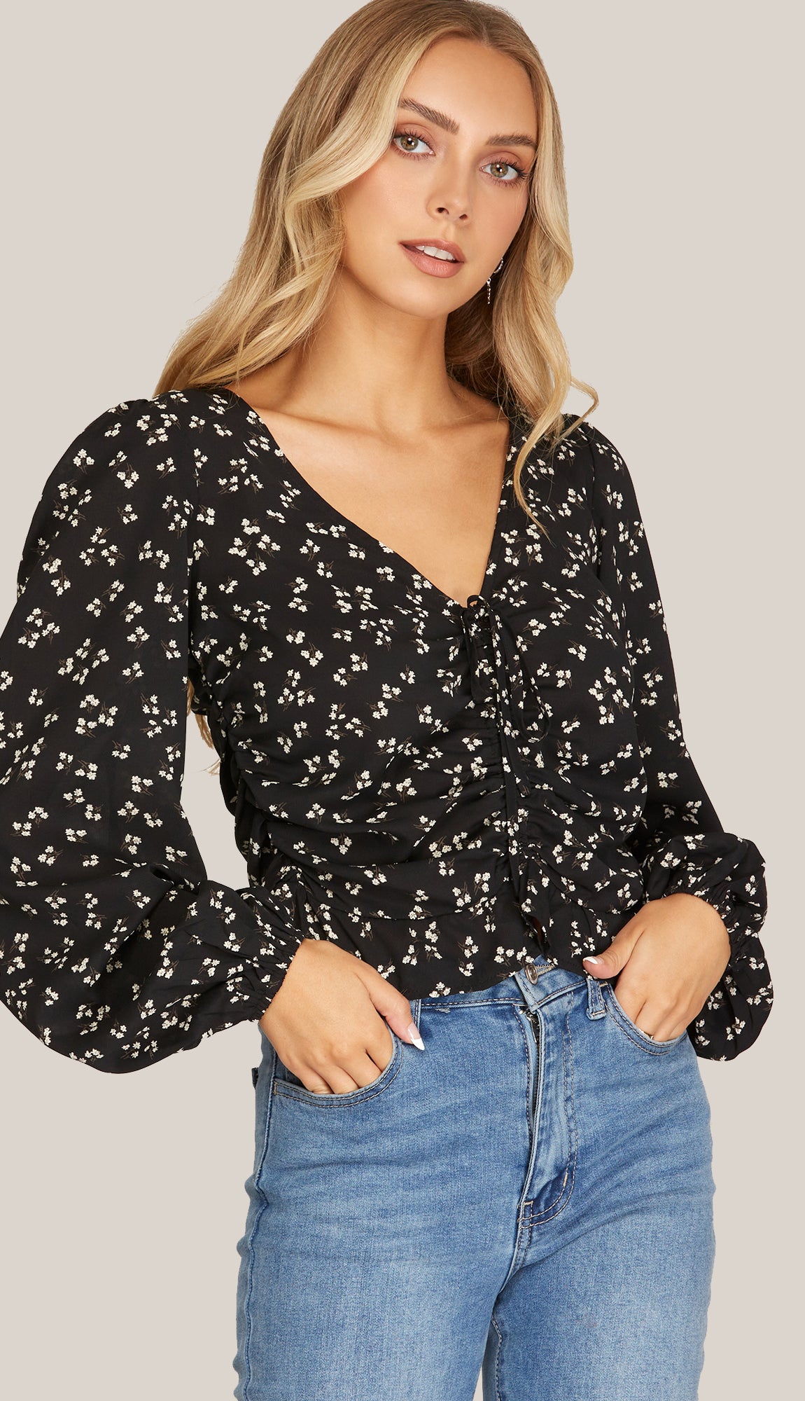 A long sleeve woven print ruched top with the prettiest floral print. Made out of 100% polyester. Model is 5'7 wearing a size small. Fits true to size.