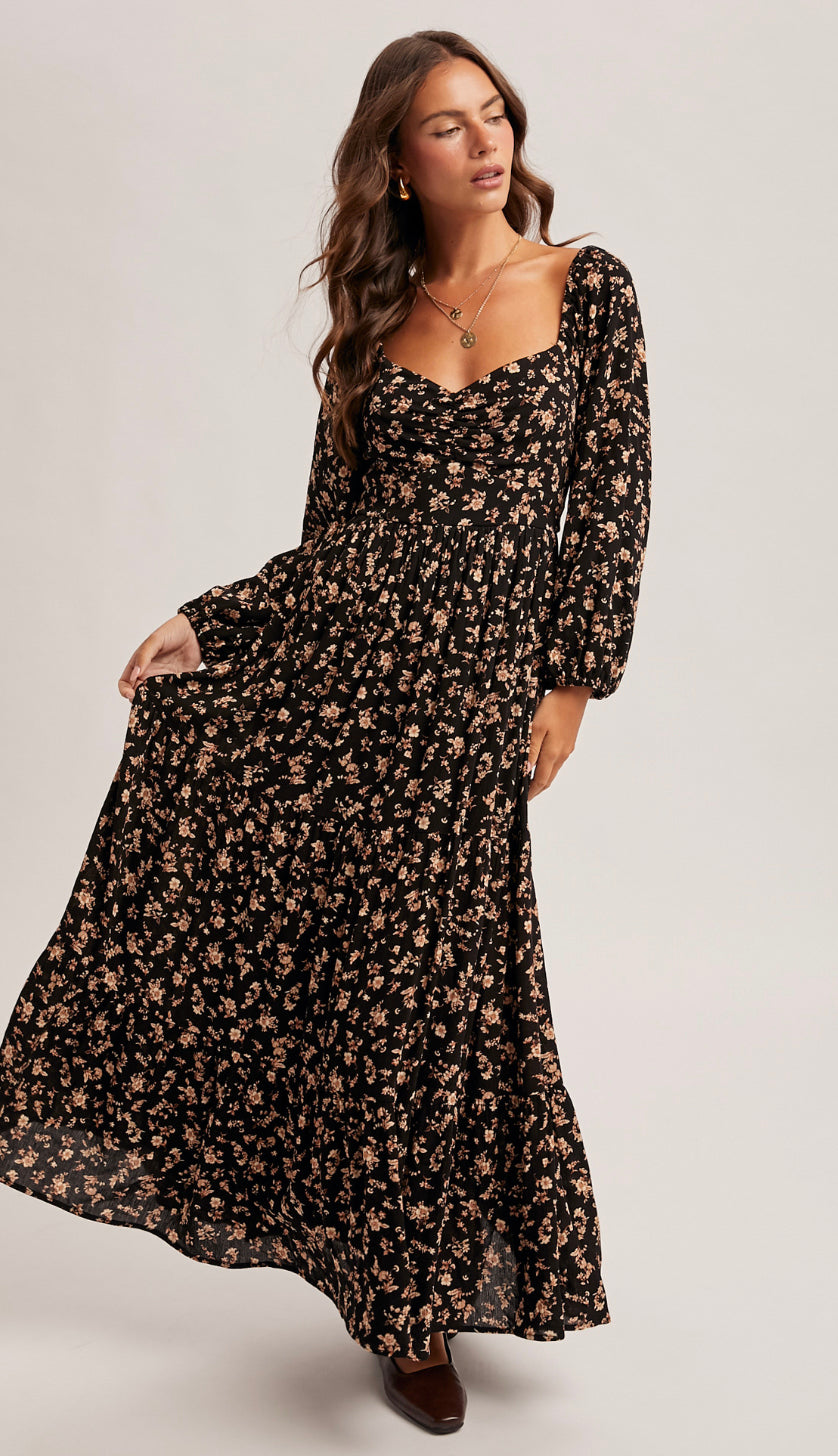 A ruched bust heart neckline balloon sleeve smocked back floral midi dress. Made out of 100% viscose. Lining is 100% polyester. Model is 5'8 wearing a size small. Fits true to size.